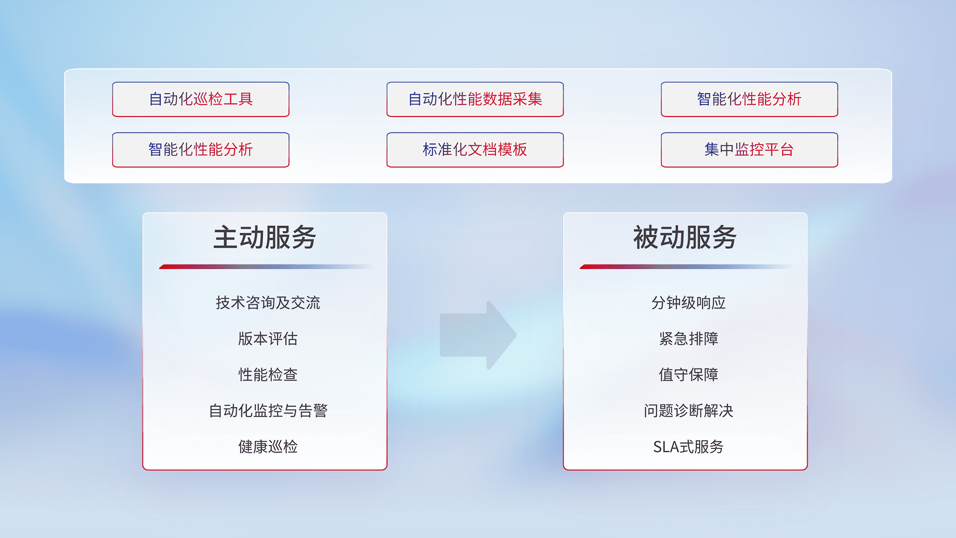 智能化工具和标准化文档,,,,保障服务质量,,提供主动服务(包含技术咨询、、、、版本评估、、、性能检查、、、、自动化监控与告警、、、、健康巡检)和被动服务包含(分钟级响应、、、紧急排障、、、值守保障、、、、问题诊断解决、、SLA服务)。。