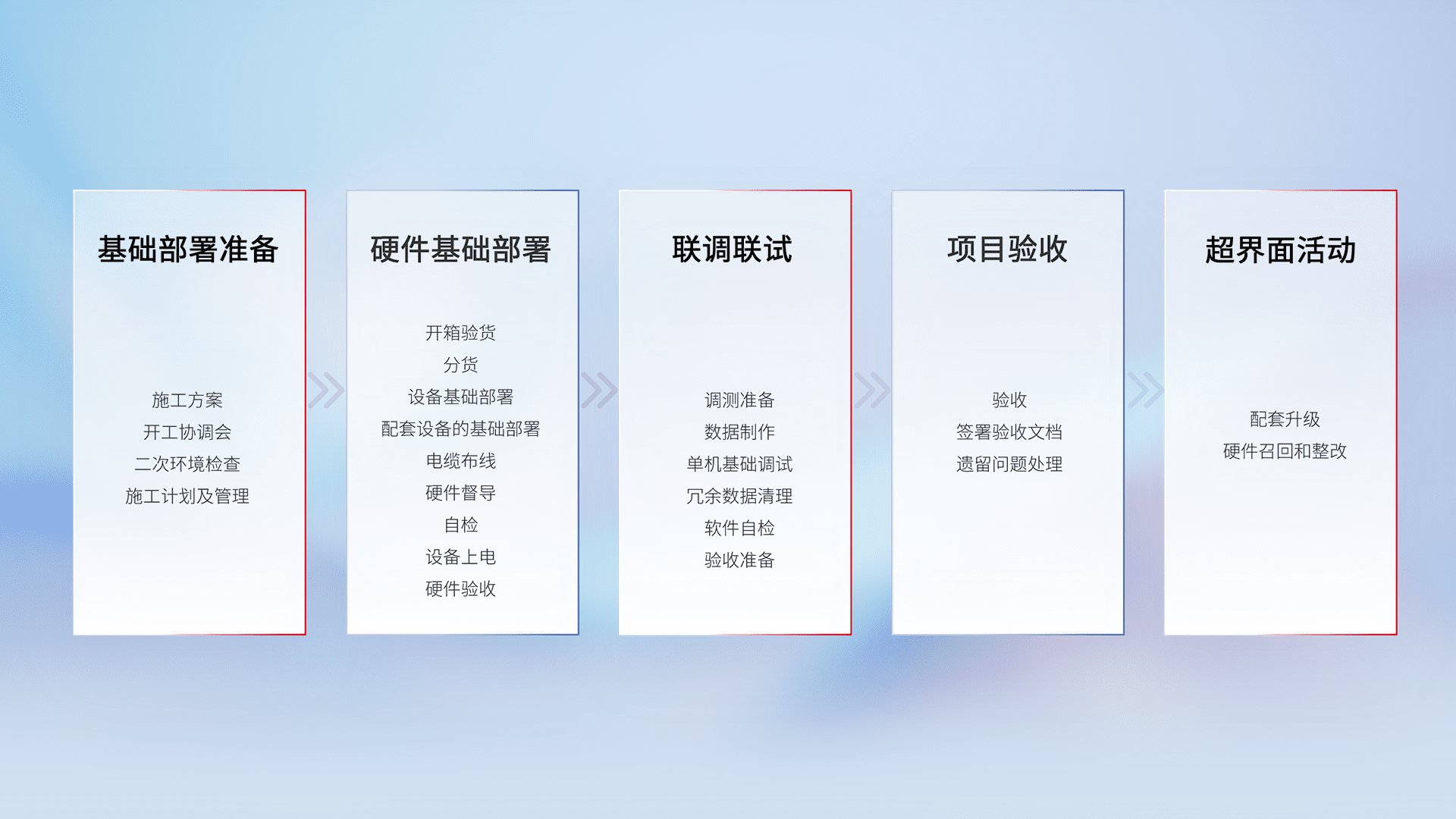 从基础部署准备、、、、硬件基础部署、、、联调联试、、、项目验收、、、越界面活动的全过程可追溯,,,保证施工质量和进度。。。